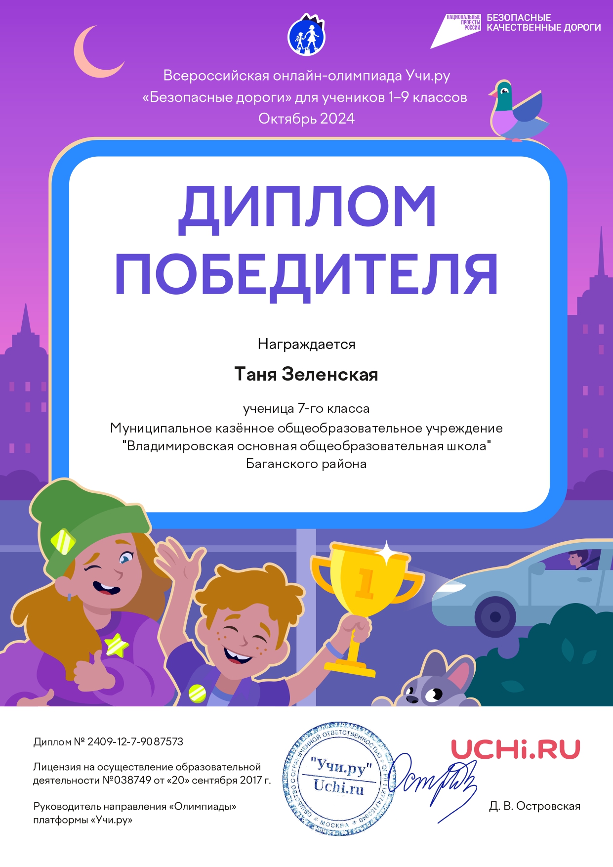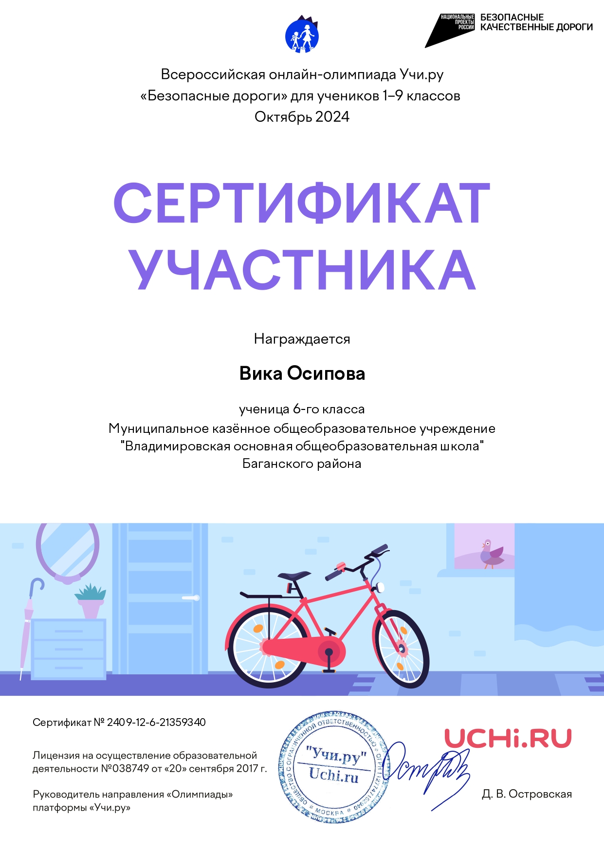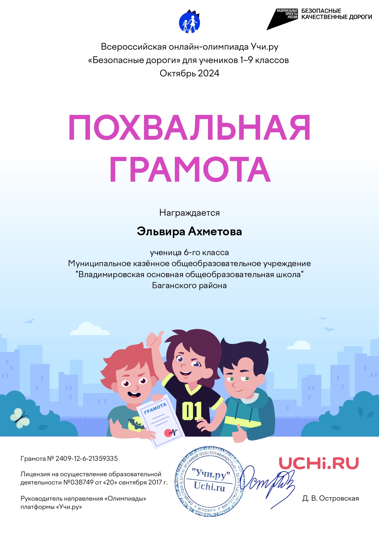 С 24 сентября по 27 октября на портале Учи.ру для обучающихся 1-9 классов при поддержке нацпроекта «Безопасные качественные дороги» прошла олимпиада «Безопасные дороги».